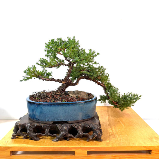 Japanese Juniper (J. procumbens) trained and wired in a semi-cascade style.